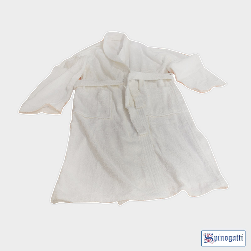 Accappatoio in spugna in puro cotone doppio ritorto, senza cappuccio, colore bianco, misure S, M, L, XL, XXL. Su richiesta è possibile realizzarlo anche con il cappuccio.